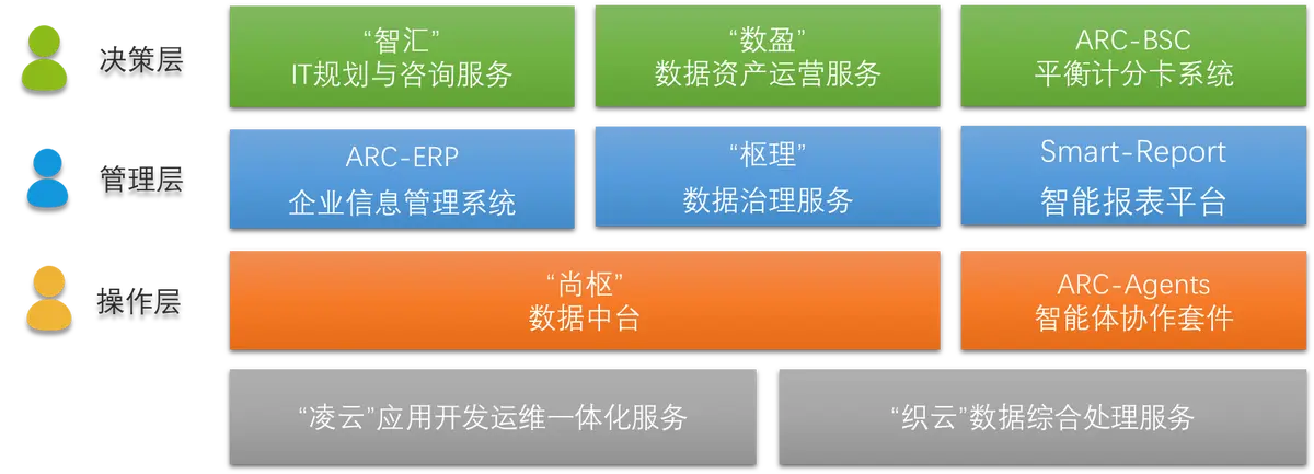 在決策層,“智匯”IT規劃與咨詢(xún)服務(wù),憑借專(zhuān)業(yè)團隊對行業(yè)趨勢和技術(shù)生態(tài)的深度洞察,為企業(yè)量身定制契合發(fā)展戰略的IT架構藍圖,明晰數字化路徑;“數盈”數據資產(chǎn)運營(yíng)服務(wù),挖掘企業(yè)數據價(jià)值,將分散數據轉化為可運營(yíng)、能創(chuàng )造效益的資產(chǎn),驅動(dòng)業(yè)務(wù)創(chuàng )新;ARC - BSC平衡計分卡系統,以戰略為導向,從財務(wù)、客戶(hù)、內部流程、學(xué)習與成長(cháng)等維度,量化指標、監控進(jìn)度,助力科學(xué)決策 。